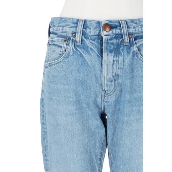 1950年台前後のDENIMからインスパイアされたオーセンティックなストレート。ウエスト・後部には尾錠があり、多少のアジャストが可能です。生地は糸使い、染色、織設計をバランスよく設計したことにより実現した独特のアタリ・シボ感・風合いが特徴の綿100%デニムを採用