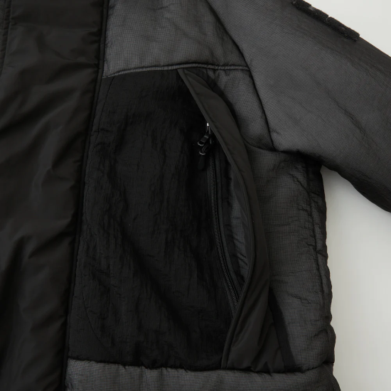 【ブランド概要】 White Mountaineering(ホワイト マウンテニアリング)は2006年秋冬にスタートした日本のファッションブランドです。 アウトドアに焦点を当てていて、ギャルソン出身のデザイナーさんが手掛けるブランドの中でも他とはまた異なる視点で勝負されているブランドです。 【商品詳細】 アメリカ発のアウトドアブランドWILD THINGSとのコラボレーションアイテム。 ゆとりのあるオーバーサイズで製作しています。 米国特殊部隊で採用されている「PCU LEVEL7」モンスターパーカーをタウンユース向けにアレンジしたモデル。 独特な透け感と軽さ・強度を併せ持つ3Dリップストップ生地をメインに使用。 裏地にはWINDSTOPPER®︎機能を搭載し防風性を高めています。 中綿には軽量・保温性・撥水性に優れたPRIMALOFT®︎を使用しており、充実した機能性です。 内側にはパラシュート装備から着想を得た、袖を抜いて背負えるショルダーストラップを装着しています。 ミリタリーな雰囲気を残しつつ、シティライクに仕上げた一着となります。