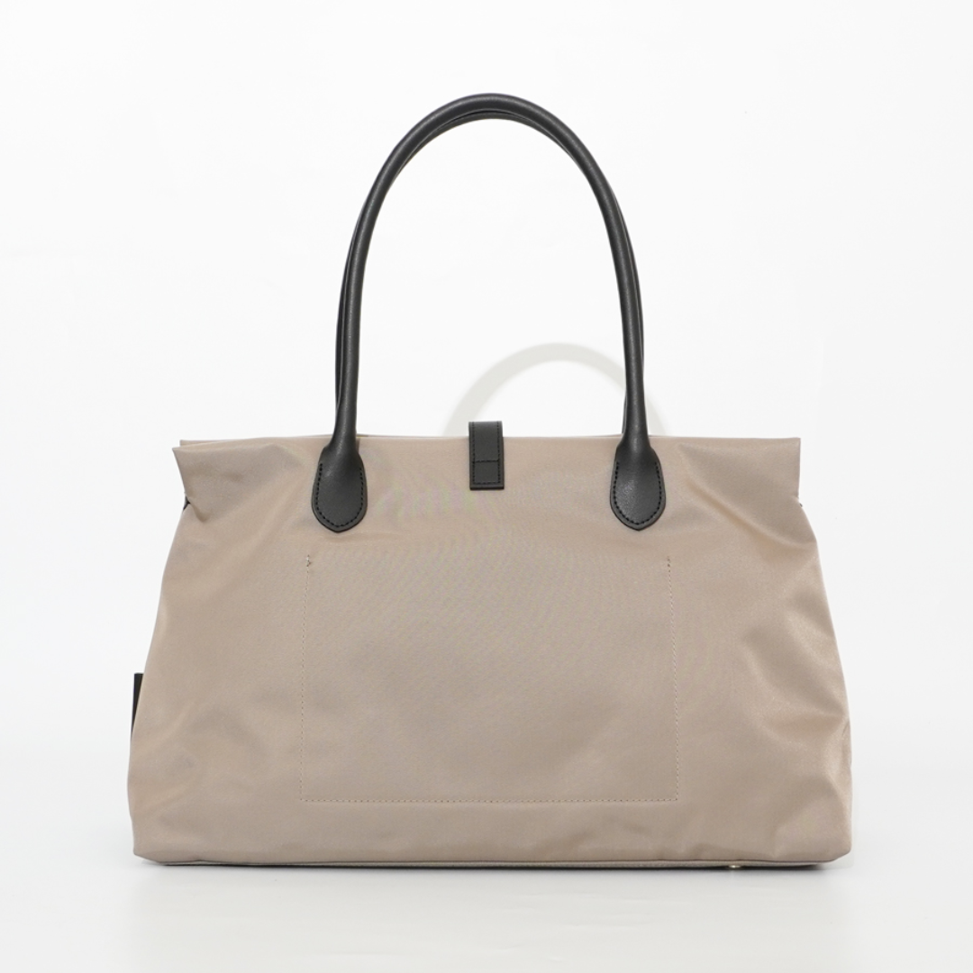 【商品詳細】 キレイめな雰囲気でお使いいただけるナイロンのトートバッグのLサイズ。 裏加工を施したナイロン生地を裏地を落とさず使用しているので、適度な抜け感と軽さがありながらお仕事でも使っていただける雰囲気で弱撥水性があるのでお手入れも簡単です。 A4サイズが収納でき、肩から無理なくかけられるのも魅力です。 [製品仕様]ファスナー開閉 付属:底板 内側:オープンポケットx1 重さ:402g