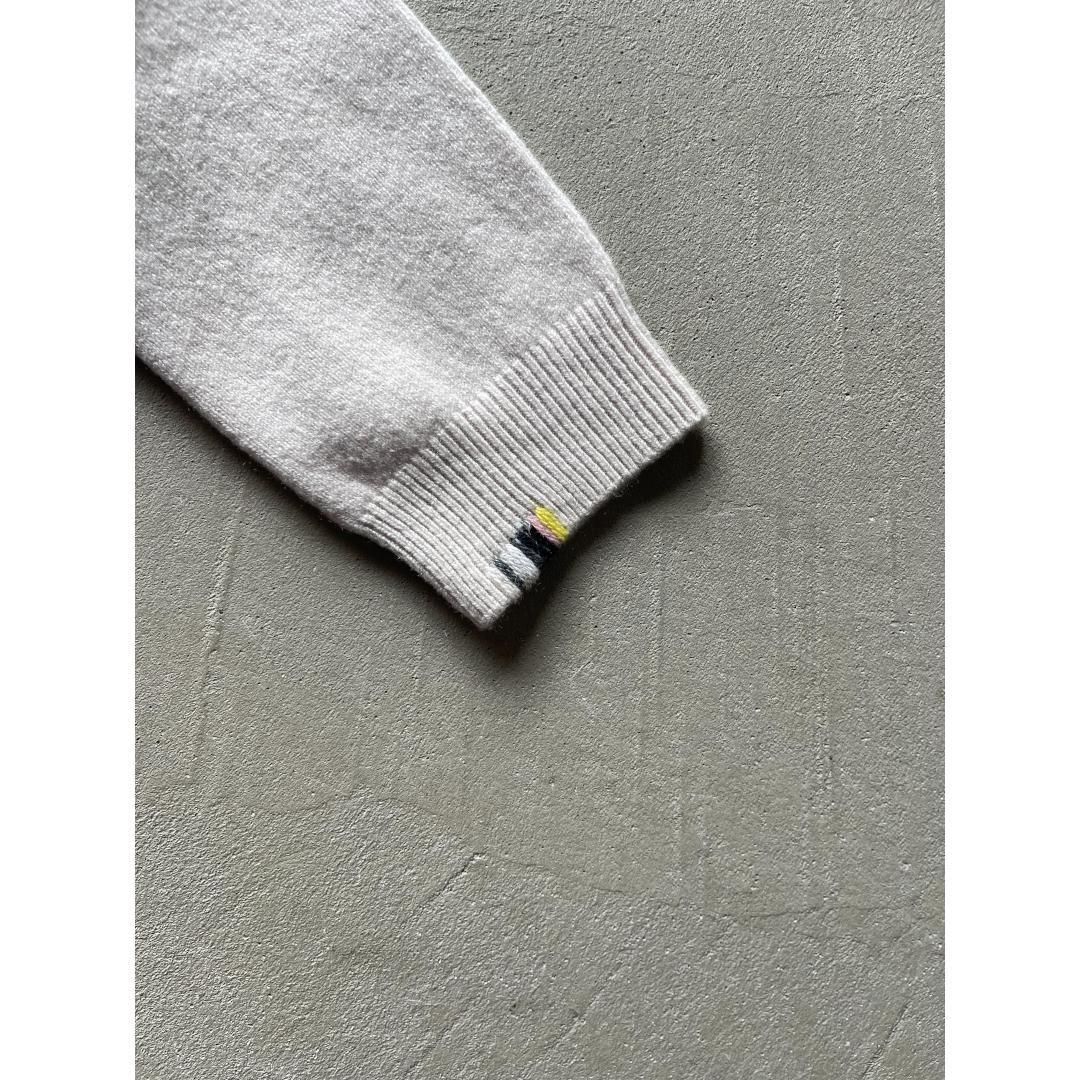 袖は長めで、襟元・袖口・裾はリブ編み仕上げ。ミニマルながら存在感のある一着です。