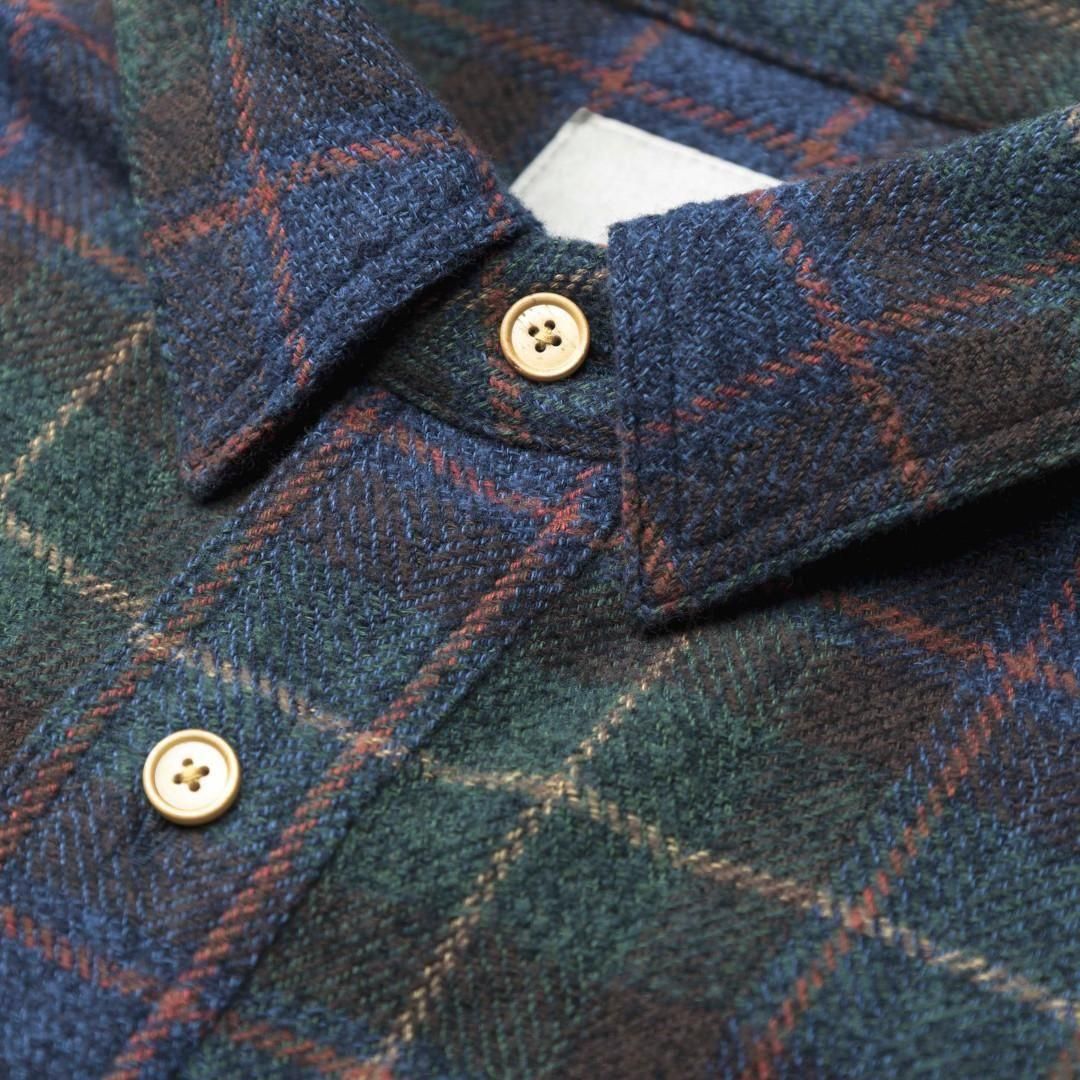 当店はMADNESSの正規取扱店です 【ブランド概要】 香港の人気俳優 Shawn Yue(ショーン・ユー)が手がけるブランド 【商品説明】 コットンチェック生地の表面を掻き上げてツイード調に仕上げたレギュラーカラーシャツ。 左胸にペンホルダー付きパッチポケット、袖はいってこい始末、裾は大きくラウンドしたシルエット。 30s以前のワークウェアに見られるチンストラップが付属するユニークな意匠も特徴。 小ぶりな襟型、ドロップショルダー、身幅にゆとりのあるシルエット。 【素材】 100% COTTON 【サイズ】 L 撮影環境や、お使いのモニターによって、実際の商品と色味が異なる場合がございます。 平置きにて採寸を行っておりますが、若干の誤差が生じる場合がございます。 ※店舗と在庫を共有しているため、ご購入後にキャンセルさせていただく場合がございます。予めご了承いただけますようお願い申し上げます。