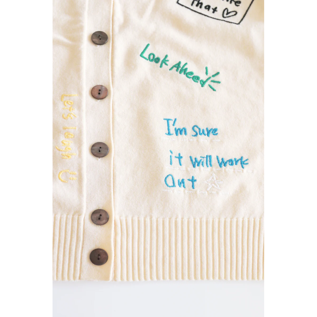 【ブランド紹介】 モード、フェミニン、カジュアル。型にはまらないジャンルレスをTORRAZZOらしく上品に。 ニットのプロフェッショナルとして、まとう人がより美しくなり、着心地のよさを感じてもらえるよう 徹底的にこだわったシルエット。 トレンドをつかみ、気分を高揚させるカラーワーク。 関わるすべての人を大切にした “ふくづくり”をコンセプトにしています。 【商品の特徴】 昨年大好評だったオリジナルの刺繍が入ったカーディガン。 今期も笑顔になれるような素敵なメッセージをたくさん詰め込んでお作りしました。 お素材はアップデートし、手触りが良く、扱いやすい安心感のある糸を使用しました。 レザーやチュールフリルなど、デザイン感の強いボトムスを合わせると程よくモードな雰囲気がでてオススメです。 【素材】 (本体)ポリエステル60% アクリル20% ナイロン15% 毛5% (刺繍部分)アクリル100%