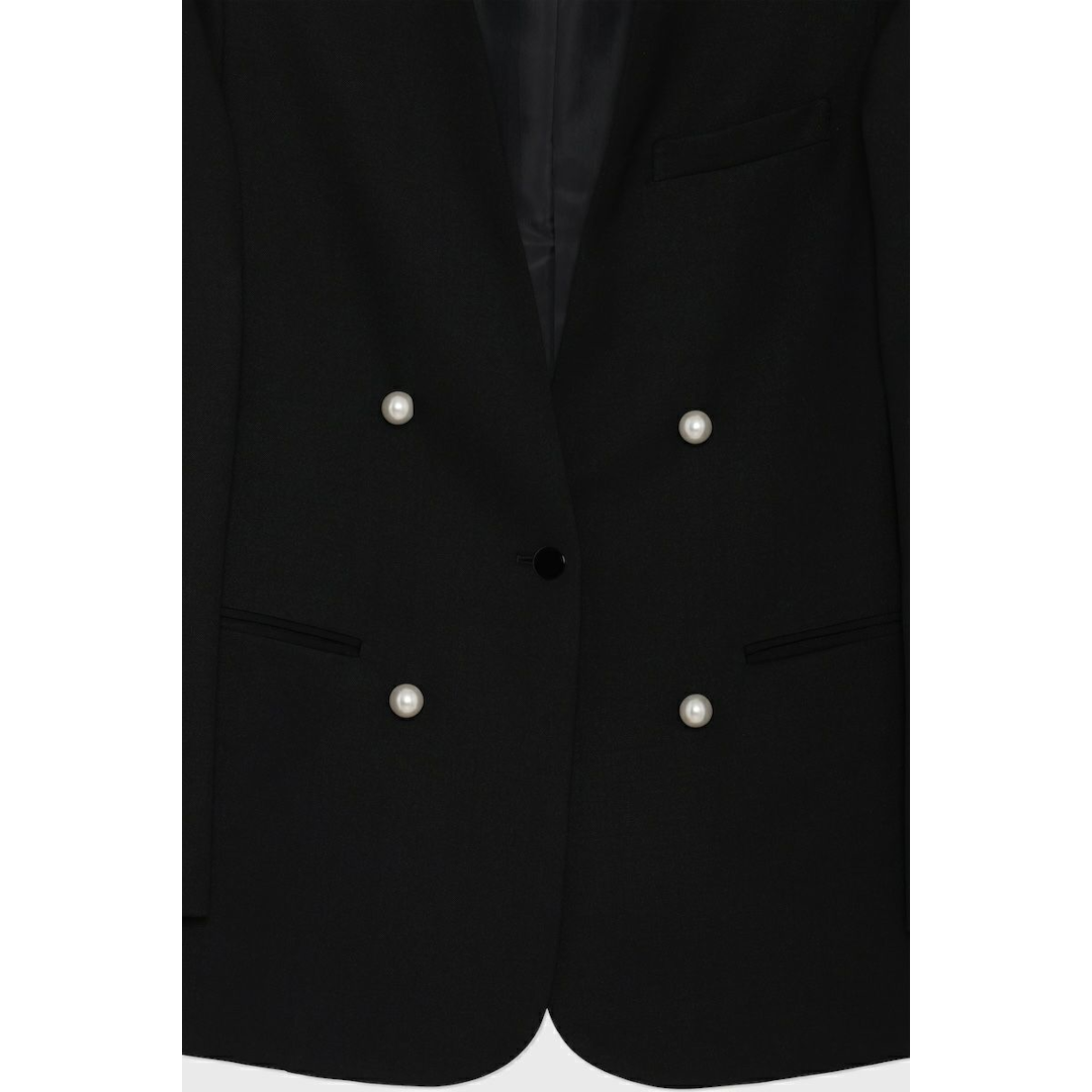 【商品詳細】 ミニマルな襟元によりシックな印象を与えるジャケット。 パール調ボタンが華やぎを添え、特別なシーンにも映えるデザインに仕上げています。 ■FABRIC ・梳毛の2/60を使用したヴィンテージギャバジン素材 ・シワになりにくく、程よい落ち感 ・ウール100%、裏地はキュプラ100% ■DESIGN ・ノーカラー仕様でミニマルかつシックな印象 ・フロント左右に配したパール調ボタンがアクセントに ・留め具は身頃同色のミニマルボタンで統一感を演出 ・袖口にもパール調ボタンを配し、後ろ姿にもエレガンスをプラス
