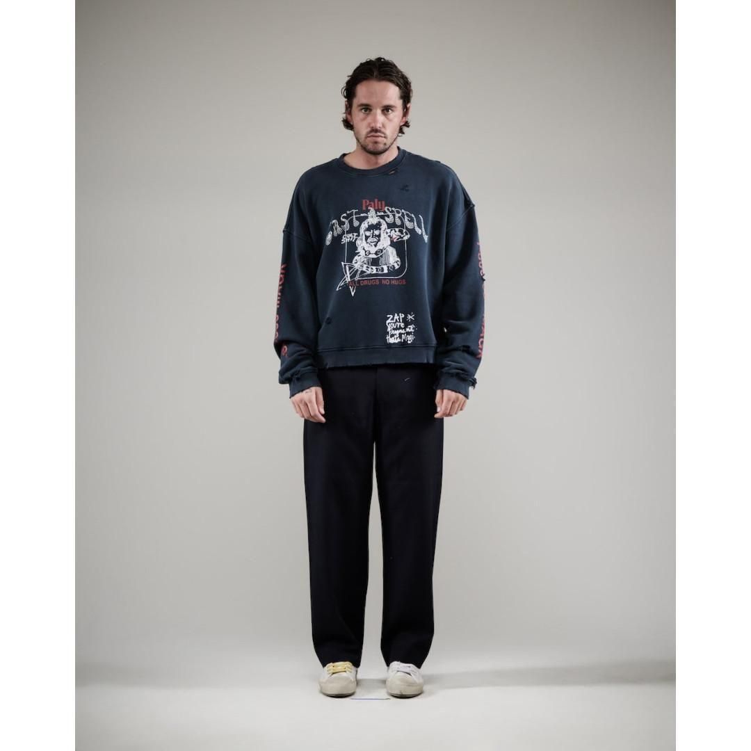 当店はPaly Hollywoodの正規取扱店です 【ブランド概要】 Paly Hollywoodは、2020年にロサンゼルスで誕生したファッションブランドである。 俳優・アーティストとしても知られるジェームズ・フランコと、デザイナーのカイル・リンドグレンが共同で立ち上げた。 ブランド名は、フランコの故郷である「Palo Alto」と、映画の象徴である「Hollywood」を組み合わせた造語に由来。 【商品説明】 ・ユニセックス仕様のクルーネックスウェット ・ドロップショルダーのオーバーサイズフィット ・510gのカスタムニット裏毛(ヘビーウェイト)を使用 ・袖口・裾・ボディにダメージ加工あり ・フロントにラインストーンを重ねた装飾ディテール ・フロント・バック・スリーブにプリントされたオリジナルアートは、洗い加工により自然な風合いに ・MADE IN LOS ANGELES 【素材】 コットン 100% 【サイズ】 M/L: 着丈66 身幅71.1(cm) 表記はあくまで目安サイズ表記となりますので、予めご了承くださいませ。 撮影環境や、お使いのモニターによって、実際の商品と色味が異なる場合がございます。 平置きにて採寸を行っておりますが、若干の誤差が生じる場合がございます。 ※オンラインストアに掲載されている商品は、実店舗と在庫を共有しているため、ご注文のタイミングによってはすでに完売となっている場合がございます。 そのため、ご購入後でもやむを得ずキャンセルのご案内をさせていただく場合がございますこと、予めご了承いただけますようお願い申し上げます。ます。